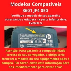 Atenção Verifique o modelo do seu aparelho observando a etiqueta na parte inferior dele Após a compra, envie o modelo da sua parafusadeira para melhorar o atendimento. Atenção para garantir a compatibilidade correta do seu carregador, é obrigatório fornecer o modelo do seu equipamento após a compra. Por favor, envie esta informação para nós imediatamente para evitar erros