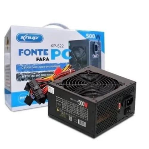 Características: – Fonte de Alimentação ATX 500 W – Conectores: 1 ATX 20+4 pinos 1 AUX-12V 4 pinos 3 SATA 2 IDE 1 PCI-E 6 pinos – Potência máxima de 500 W – Alimentação Bivolt 110/220 Vac – Chave seletora de tensão – Acompanha cabo NBR14136 – Compatível com placas-mães de 20 e 24 pinos – Dimensões do cooler: 120 x 120mm – Conector de alimentação para HD SATA – Circuito micro processado – Proteção contra picos e surtos de tensão – Estrutura de metal – Silenciosa Conteúdo: – 1 Fonte de Alimentação 500W – 1 Cabo de Força NBR14136 Fabricante/modelo – Knup – KP-522