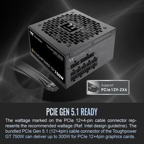 Thermaltake Fonte de alimentação padrão Toughpower GT 750W ATX 3.1; 80 Plus Gold Efficiency; Smart Zero Fan; conector PCIe 5.1 nativo de 300W; PS-TPT-0750FNFAGU-3; garantia de 5 anos