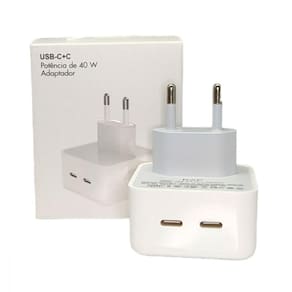 Fonte de carregamento com 02 portas USB Tipo-C, potência total de 40W. Entrada AC 100-240V 50/60Hz 1.7A. Saída individual de 5V=3A, 9V=2.2A, 12V=1.67A por porta. Saída combinada de 20W + 20W = 40W Max.Tipo