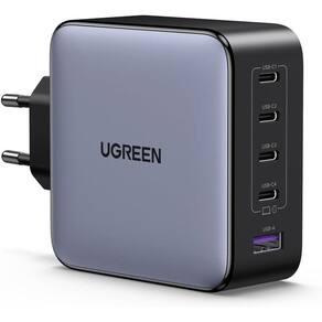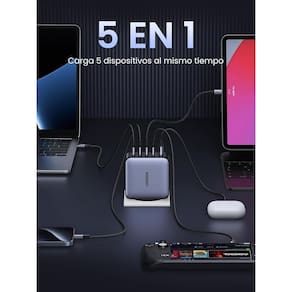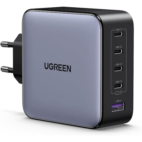 Carregador rápido de 5 portas com tecnologia GanInfinity. Possui tecnologia ThermalGuard para monitoramento de temperatura em tempo real, invólucro à prova de fogo e proteções contra sobrecarga, surtos e curtos-circuitos. Compatível com múltiplos protocolos de carregamento rápido (PD 3.0, Galaxy PPS 45W/25W, QC 4+/4.0/3.0, FCP). USB-C1/C2/C3 suporta 100W/Galaxy 45W, USB-C4 suporta Galaxy 25W.Tipo
