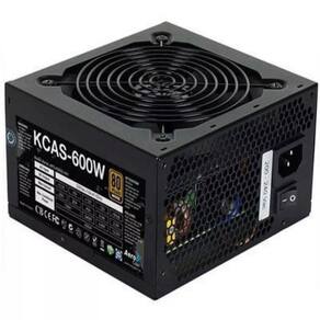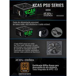 Fonte Gamer ATX Aerocool KCAS 600W 80 Plus Full Range APFC Modelo: KCAS 600W A Fonte Gamer ATX Aerocool KCAS 600W é a escolha ideal para quem busca mais potência para seus sistemas. Com 600W, esse modelo é capaz de atender demandas mais exigentes – dependendo da placa de vídeo e processadores. Equipada com certificação 80 Plus Bronze e PFC Ativo, ela oferece eficiência energética e estabilidade. Por outro lado, a sua configuração full range garante compatibilidade total, proporcionando confiança e desempenho para melhorar a experiência de jogo ou trabalho. Características: - Pinos: 1x Placa Mãe (20+4 Pinos), 1x CPU (12v 4+4v Pinos), 2x VGA (PCI-E 6+2 Pinos), 7x SATA, 4x PATA, 1x FDD - Tensão Entrada: 115~230VAC 4.5A 47-53HZ - Tensão Saída: +3.3V / +5V / +12V / -12V / +5VSB - Corrente: 20A / 20A / 45A / 0.4A / 2.5A - SATA: 7 conectores Informação adicional: - 80 Plus Bronze com PFC Ativo - Compatível com ATX12 - Comprimento do cabo de 20 + 4P e CPU 4 + 4P até 550 mm - fácil alcance para todos os componentes - Dois conectores PCIe 6 + 2 pinos para placas de vídeo - Fan de 12 cm super silencioso com controle inteligente de velocidade - Roteções completas com OVP / UVP / OPP / SCP / SIP - Segurança e EMC certificada pela CE e TUV - ECO amigável com as diretivas RoHS e Erp 2013 - Full Range (Bivolt Automática)