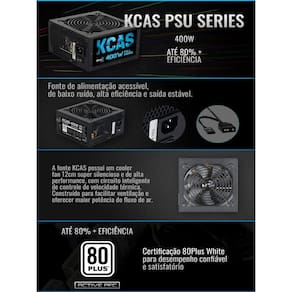 Fonte Gamer ATX Aerocool KCAS 400W 80 Plus Full Range APFC   Modelo: KCAS 400W   A Fonte Gamer ATX Aerocool KCAS 400W é a escolha ideal para iniciantes. Fazendo parte da linha KCAS, esse modelo conta com certificação 80 Plus White e PFC Ativo, garantindo eficiência energética e estabilidade. Já sua configuração full range atende às necessidades básicas de energia para seu setup gamer, proporcionando confiabilidade e desempenho a um preço acessível.   Características: - Dimensões: 150 x 86 x 140mm - Peso: 1.7Kg - Potência: 400W - Pinos: 1x Placa-mãe 20+4/ 1x VGA 6+2/ 1x CPU 4+4/ 1x PCIe/6x Sata/ 3x Pata/ 1x FDD - Tensão Entrada: 115~230VAC 6-3A 47~63Hz - Tensão Saída: +3.3V/+5V/+12V/-12V/5VSB - Corrente: 20A/20A/30A/0.4A/2.5A - Ventiladores: 12cm   Informação adicional: - Compatível com ATX12V Ver.2.3 - Até 80% + eficiência com certificado oficial White 80Plus - Comprimento do cabo de 20 + 4P e CPU 4 + 4P até 550 mm - fácil alcance para todos os componentes - Fan de 12 cm super silencioso com controle inteligente de velocidade - Proteções completas com OVP / UVP / OPP / SCP / SIP - Segurança e EMC certificada pela CE e TUV - ECO amigável com as diretivas RoHS e Erp 2013 - Compatível com ATX12V - PFC Ativo - Certificado 80 Plus garantindo 80% da eficiência da fonte - Proteção: OVP / UVP / OPP / SCP / SIP - Full Range (Bivolt Automática)