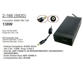 2-166 (5920) 138W Input: AC100-240V Output:DC 19V 7.3A Internal Diameter: 2.5mm External Diameter: 5.5mm DC Connector size: Compatible ASUS 19V 7.3A - Padrão Compatível: ACER/ ASUS - 19v 7.3A - 138W - Plug: 5.5x2.5 - Part No. ADP-150NB D, 90-XB06N0PW00040Y, 04G266009901, 04G266009902. - Fonte Similar Asus ADP-150NB D - Computadores ALL IN ONE