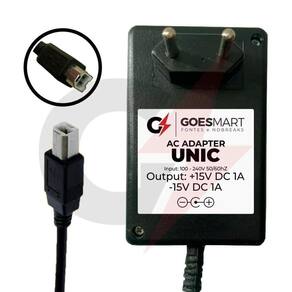 Possui entrada bivolt automática de 100v a 240v com frequência de 50/60hz, permitindo uso em qualquer região sem necessidade de seletor de tensão. A saída é simétrica, com +15v dc 1a e -15v dc 1a, atendendo exatamente às especificações exigidas por mesas unic que utilizam esse padrão.