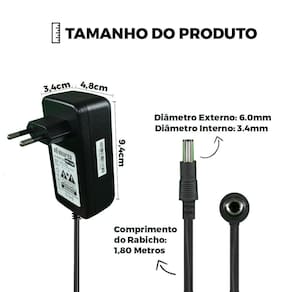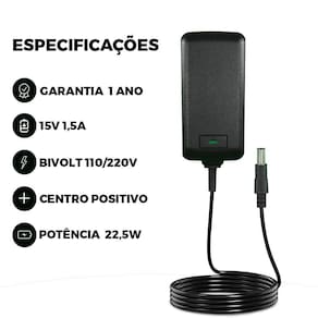Quais as especificações do produto - input: bivolt 110 - 240v 50-60hz 0.33a - output: 15v - 1.5a positiva - plug: 6,0mm x 3.4mm - comprimento do rabicho: 1,80 metros - cabo de força: acompanha - medidas da fonte: comprimento = 8,7 cm / largura = 4,8 cm / altura = 2,7 cm - cor: preto - atente-se também ao pino conector, ele deve ser igual ao utilizado no seu aparelho comprimento e largura .