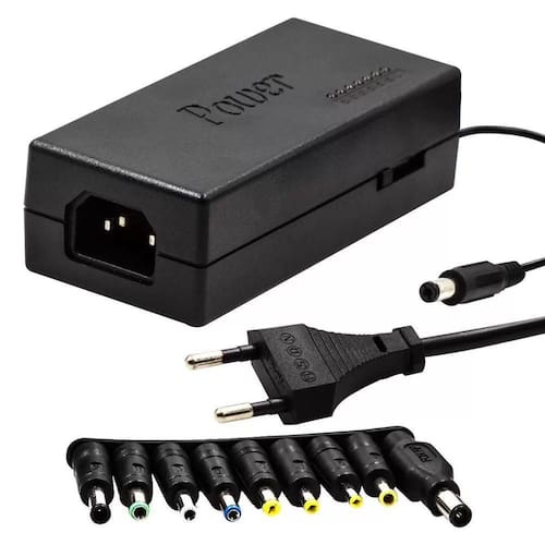 Carregador Universal Portátil para Notebook. Usa o seu computador por falta de fonte de energia. Este adaptador Ac/Dc de alta potência é fabricado para alimentar notebooks que requerem entrada Dc de 12V a 24V. Além disso, ele acompanha 9 conectores, que encaixam na maioria dos notebooks. Basta conectar o carregador em uma tomada de energia elétrica e usar seu notebook sem complicações.