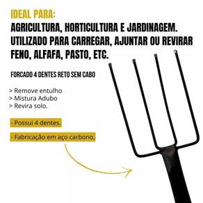 O forcado reto COLLINS é mais um produto feito com todo o esmero e excelência que só quem foi pioneira na fabricação de ferramentas no Brasil pode garantir.Ele é ideal para: Remover entulho Misturar Adubo Revirar soloO forcado tem como principais características: Acabamento em tinta eletrostática, o que gera uma melhor apresentação visual e maior proteção contra oxidação e corrosão. Olho de 3,5 cm de diâmetro. Fabricação em aço carbono AISI 1070 temperado, a melhor liga no quesito resistência, durabilidade e rigidez. Corpo em aço temperado, proporcionando menor desgaste durante o uso.Demais informações:Peso: 686g