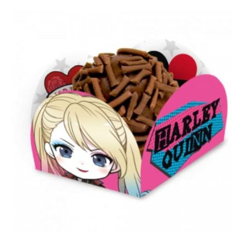 Forma 4 Pétalas Arlequina C/40 Festcolor. Inteligente, destemida e muito habilidosa, é a parceira fiel de Coringa, Arlequina. O tema da heroína imprevisível e de personalidade vibrante vai te garantir uma festa com muita diversão e estilo! Deixe a sua mesa principal ou de convidados ainda mais elegante com essas lindas forminhas, que possui estampa dentro e fora.