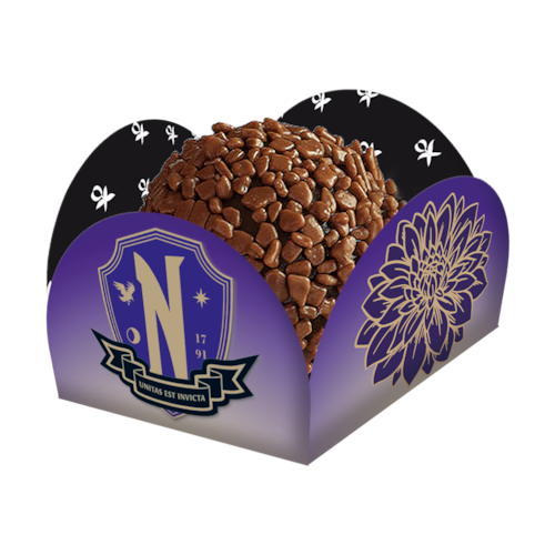Forma 4 Pétalas Wandinha C/40 Festcolor. Amiga inseparável de sua "mãozinha", curiosa, autoconfiante e muito determinada, essa é a Wandinha! Um tema com a mistura perfeita de escuridão e mistério, que irão impressionar seus convidados! Deixe a sua mesa principal ou de convidados ainda mais elegante com essas lindas forminhas, que possui estampa dentro e fora.