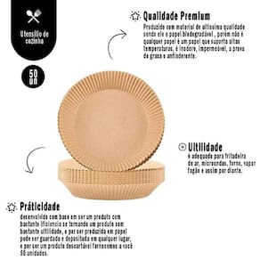 A Forma de Air Fryer Descartável é compatível com a maioria dos modelos de fritadeiras elétricas de 3 a 5 litros. Cada embalagem contém 50 unidades de formas descartáveis, que podem ser usadas uma única vez. As medidas da forma são 16 cm de diâmetro e 4,5 cm de altura, e a temperatura máxima suportada é de 220º. A cor da forma é bege, neutra e discreta.