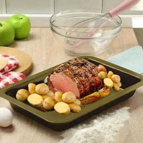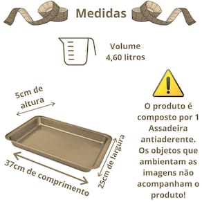 Dimensões aproximadas: 5cm x 25cm x 37 cm Material: Aço Carbono Com Revestimento Antiaderente Conteúdo: 1 Assadeira Antiaderente