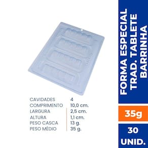 Quantidade: 01 Cavidade: 4 Comprimento: 100 mm x Largura: 25 mm x Altura: 11 mm Peso casca: 13 g Peso médio: 35 g Modelo: Especial (3 Partes)