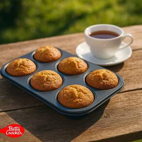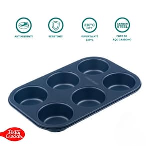 Forma para Cupcake, Muffin e Mini Bolinhos Betty Crocker. Fabricada em aço carbono de 0,5 mm com revestimento antiaderente premium. Suporta temperaturas de até 232°C. Livre de PFOA, PTFE, BPA e cádmio. Ideal para muffins, cupcakes, empadinhas e muito mais.Chapa antiaderente