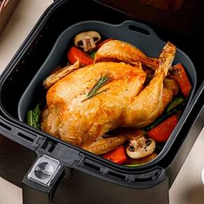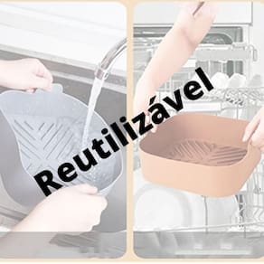 Forma de cesto forro protetor para air fryer de silicone x000d x000d Forma em silicone quadrada antiaderente são resistentes, maleáveis e reutilizáveis para air fryer. Muito fácil de utilizar, é só encaixar dentro da fritadeira e após utilizar você vai notar que a sujeira não gruda, pois ela é toda de silicone e super antiaderente. Pode ser utilizada no microondas, na fritadeira, no forno, lava-louças e freezer. É uma solução completa.