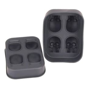 Forma De Gelo Caveira Para fazer gelo ou chocolate em formato de caveiras. O seu drinque com um toque especial. Cada forma faz 4 caveiras 4,6 x 4 cm. Confeccionada em silicone flexível, suporta até 240 graus centígrados não expor diretamente as chamas Dimensões 10 x 8 x 4,5 cm.