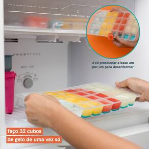 Essa é a forma de 32 cubos de gelo da Oikos. Essa desenforma cubos de gelo ou qualquer outro conteúdo um jeito mais prático. Por ter o fundo de silicone, basta pressionar a base um por um para remover seus cubinhos, que podem ser de gelo ou de outras bebidas. Super prática, faz até 32 cubos de gelo de uma vez só. Para lavar, é bem simples: água morna e detergente neutro, mas também pode IR na lava-louças.