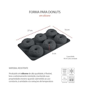 A Forma de Silicone é perfeita para preparar receitas com praticidade, resistencia e segurança. Produzida em silicone, é flexivel, duravel, resistente ao calor e de facil higienizaçao. Suporta temperaturas de aproximadamente -40 °C a 230 °C, garantindo versatilidade no uso. Com 6 cavidades de 90 ml cada, com resultados uniformes e desmolda com facilidade, sem grudar. Pode ser usada no forno, freezer e air fryer, tornando o preparo muito mais rapido e pratico para donuts, rosquinhas e bolos.