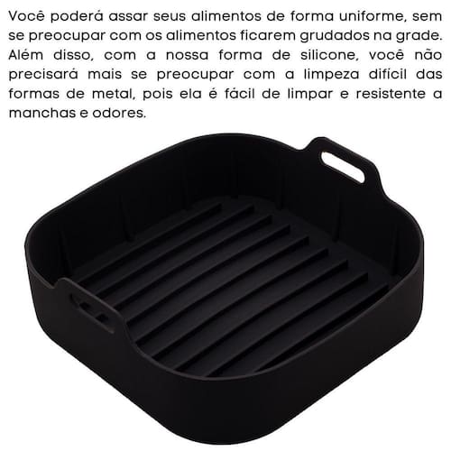 Estamos aqui para apresentar a você um produto incrível que transformará sua vida na cozinha:A forma de silicone quadrada para air fryer.Imagine como seria mais fácil preparar seus alimentos favoritos no air fryer com essa forma que se encaixa perfeitamente nele.Você poderá assar seus alimentos de forma uniforme, sem se preocupar com os alimentos ficarem grudados na grade.Além disso, com a nossa forma de silicone, você não precisará mais se preocupar com a limpeza difícil das formas de metal, pois ela é fácil de limpar e resistente a manchas e odores.A vida pode ser muito corrida, mas com a nossa forma de silicone para air fryer, você economizará tempo e se sentirá mais tranquilo a em relação às refeições.E não pense que esta forma é útil apenas para assados, você pode usá-la para preparar qualquer coisa que desejar: bolos, pães, pizzas, carnes, legumes e muito mais.Não espere mais para facilitar sua vida na cozinha.Adquira agora mesmo nossa forma de silicone quadrada para air fryer e experimente a tranquilidade que ela traz ao seu dia a dia.E lembre-se: você merece ter uma vida mais prática e fácil na cozinha. Não deixe para depois, compre agora e resolva de vez o problema de limpeza e preparo de alimentos no air fryer.============================Especificações: - Largura: 20 Cm - Profundidade: 20 Cm - Altura: 7 Cm============================Comprando nesse anuncio, você leva para casa: - 1 Forma para air Fryer