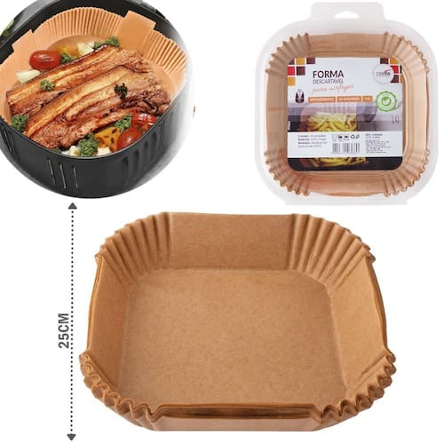 Forma de papel quadrada descartavel para air fryer / fritadeira eletrica 50 pecas 25/20cm Validade: indeterminada Tamanho aproximado da forma: 25/20cm Peso aproximado: 140g Tipo de produto: forma quadrada descartavel para air fryer / fritadeira eletrica 50 pecas Cor: bege Composição: papel