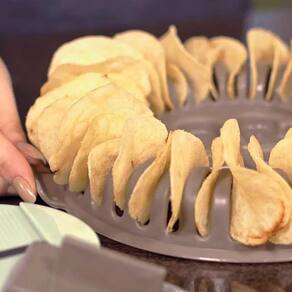 Instruções de uso: limpe e descasque as batatas, em seguida corte e coloque na forma, leve ao microondas. Não é necessário adicionar óleo, pois o próprio calor do microondas será responsável por deixar as batatas crocantes. O cozimento ocorrerá de 3 à 8 minutos dependendo da potência do microondas e conforme a textura desejada. Uma vez que as batatas estejam prontas, retire a forma do microondas e deixe-as esfriarem um pouco antes de removê-las. Com cuidado, desenforme as batatas chips e elas estarão prontas para serem saboreadas.