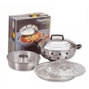 Essa incrível forma Vigorosa vai facilitar a sua vida muito mais do que imagina. Ótima no preparo de bolos, pudins, churrasco, pizza, grelhados reduzindo bastante o uso de gás. Ideal para uma alimentação balanceada e saudável. Essa forma multiuso é a queridinha da cozinha, uma vez que ela: assa pizzas, faz bolos, grelha diversos tipos de carne e faz até churrasco. Torna-se um produto de grande utilidade em sua cozinha, sendo um coringa para qualquer preparo. Formas de usar: Para grelhados - (churrasco, pescado, etc): Coloque a base com o seu orifício central sobre o queimador do fogão. Em seguida introduza a grelha com a aba para cima e sobre a mesma espalhe o alimento que será grelhado. Acenda a chama do fogão e ajuste a tampa. Não será necessário virar o alimento, pois a peça foi projetada especialmente para que haja circulação do calor por igual em seu interior. Tempo máximo para assar é de 8 a 12minutos em fogo normal. Para Bolos: Coloque a base com o seu orifício central sobre o queimador do fogão e em seguida coloque sobre a mesma a forma já com a massa do bolo. Acenda a chama do fogão e ajuste a tampa sobre a forma de bolo. Tempo máximo para assar é de 37 minutos em fogo baixo. Para Pizzas: Coloque a base com o seu orifício central sobre o queimador do fogão e em seguida introduza a forma. Coloque a massa da pizza e seus condimentos dentro da forma. Acenda a chama do fogão e ajuste a tampa sobre a forma. Tempo máximo para assar é de 5 a 8 minutos em fogo baixo. Regimes e Dietas: A forma Vigorosa é também utilizada para cozimentos sem gorduras ou óleos, deixando os alimentos com sabor natural e mais saudável. Especificações: Dimensões (LxAxP) 32,5cm x 13,5cm x 32,5cm Peso 1,522kg