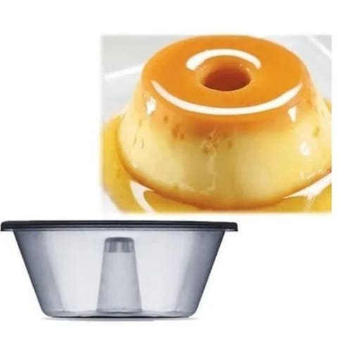 A forma é redonda com tampa e traz maior comodidade e design para pudins, doces e etc.