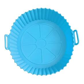 Forma reutilizável de silicone azul para air fryer, 16cm de diâmetro, resistente a altas temperaturas (-40C até 230C), flexível, antiaderente, com alças laterais para fácil remoção, segura para alimentos, não tóxica, não deforma e não solta odores.Tipo