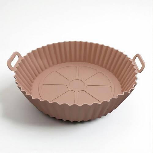 Forma reutilizável de silicone marrom para air fryer, 16cm de diâmetro. Evita que resíduos grudem no cesto, facilitando a limpeza. Fabricada em silicone de alta qualidade, livre de BPA, resistente a altas temperaturas (-40C até 230C), flexível, antiaderente e reutilizável. Possui alças laterais para remoção fácil e segura. Pode ser lavada à mão ou em lava-louças. Não deforma e não solta odores.Tipo