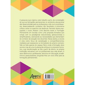 A pesquisa que originou este trabalho partiu da constatação de que as formações permanentes no ambiente educacional são desenvolvidas para os professores e não com os professores, desencadeando contextos não favoráveis à autonomia crítica e ativa no exercício da docência. Partindo desse pressuposto, o autor Robson Lima discorre sobre a Formação Permanente em Escolas como uma proposta formativa que rompe com os paradigmas reducionistas, aplicacionistas e simplificadores, valorizando as necessidades que demandam do contexto de atuação dos docentes. Nessa óptica, a escola é vista como lócus de socialização e compartilhamentos, mediados por assessores ou formadores do próprio contexto. Não se trata apenas do espaço físico onde a formação deve ocorrer, mas de uma mudança de enfoque no processo formativo, cuja transformação se dá a partir de dentro, na própria instituição educativa com os profissionais que nela atuam. A obra destina-se a professores, técnicos em educação, acadêmicos e pesquisadores, lançando-lhes um novo olhar para as formações permanentes.