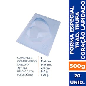 Forma especial com silicone (3 partes), ideal para produção de chocolates com muito mais praticidade e precisão. Possui uma “marquinha” indicando a quantidade necessária de chocolate, levando para geladeira uma única vez. Ela proporciona uma casca uniforme e um acabamento perfeito sempre com o mesmo peso. Abaixo mais informações do produto.