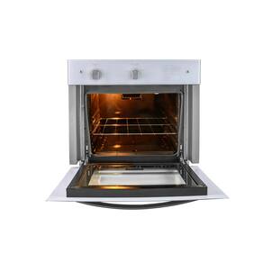 Forno a gás de embutir Stelar com capacidade de 46 litros, potência de 1500W, grill elétrico de 750W, timer de 120 minutos, temperatura regulável até 250°C, interior antiaderente, porta com vidro duplo e válvula de segurança.Timer