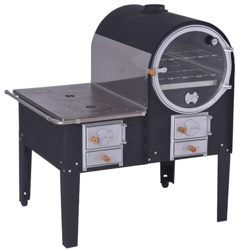 Fogão a lenha com forno, acabamento interno em aço inoxidável, pintura externa com tinta especial para altas temperaturas, porta em vidro temperado, termômetro, câmara e bandeja com revestimento em aço inox, duas grades internas, chapa de ferro fundido polida.Tipo