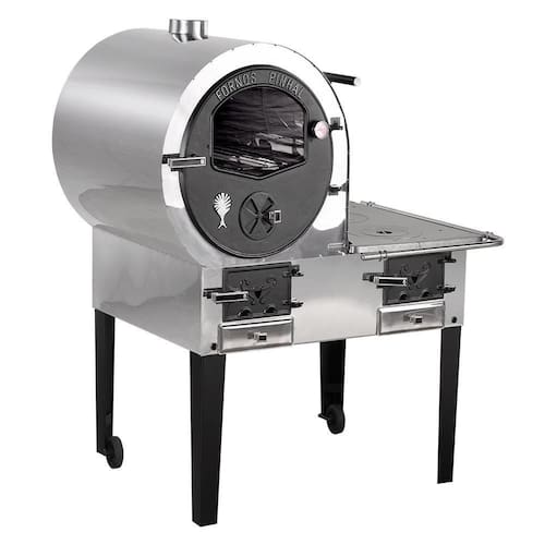 Forno acoplado com chapa do fogão no lado direito, isolamento térmico, porta do forno em ferro fundido com visor de vidro temperado, regulagem de ar, respiro para pressão, forma para gordura, proteção inox, duas grades no forno, grade do fogo em ferro fundido, rodas traseiras de borracha, termômetro e luz interna.Tipo