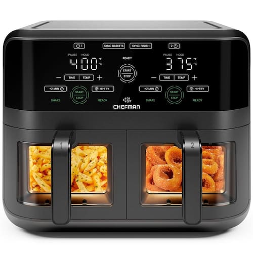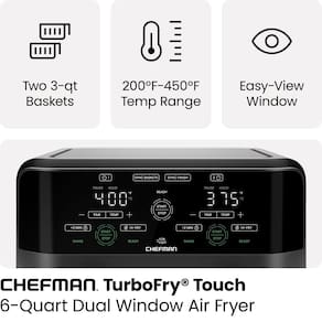 Forno de fritadeira de ar de cesta dupla CHEFMAN de 6 litros com janelas fáceis de visualizar, acabamento sincronizado, fritura alta, desligamento automático, 2 cestos de fritura antiaderentes independentes de 3 litros que podem ser lavados na máquina de lavar louça, fritadeira digital dupla