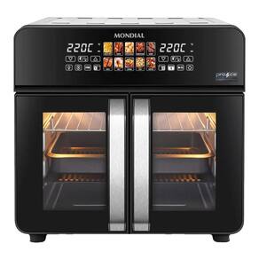 Especificações: - Modelo: AFDO-25L-FD - Dimensões do produto: 39,5cm x 40cm x 40cm (AxLxP) - Cor: Preto / Inox - Capacidade: 25L - Potência: 2000W (127V) / 2200W (220V) - Temperatura: Até 200ºC - Timer: 90 minutos - Ação do produto: Assa, grelha e frita sem óleo com ar quente. Possui Dualzone para duas receitas ao mesmo tempo e função sincronizar para deixá-las prontas juntas. - Revestimento antiaderente: Sim - Segurança: Vidro duplo, French Door, desligamento automático, alarme sonoro, painel touch, luz interna, divisória segura, pés antiderrapantes. - Luz indicadora: Sim
