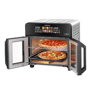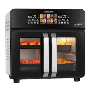 Air Fryer Forno com divisória Dualzone para preparar duas receitas ao mesmo tempo. Função de sincronização. Assa e frita sem óleo. Portas de vidro duplo. Painel touch colorido com 10 funções pré-programadas. Design em inox. Luz interna. Revestimento antiaderente. Segurança: Vidro duplo, French Door, desligamento automático, alarme sonoro, painel touch, luz interna, divisória segura, pés antiderrapantes.Forno autolimpante