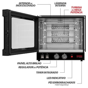 CARACTERÍSTICAS - Consumo: 1,2 Kw/h - Potência da resistência: 2.500W - Potência do motor: 1/30cv - Temperatura máxima: 250C - Acompanha 4 esteiras de 35x35cm - Possui iluminação interna de 35W - Possui timer de até 120 minutos - Possui controle de temperatura (50-250C) - Possui paredes com isolamento térmico