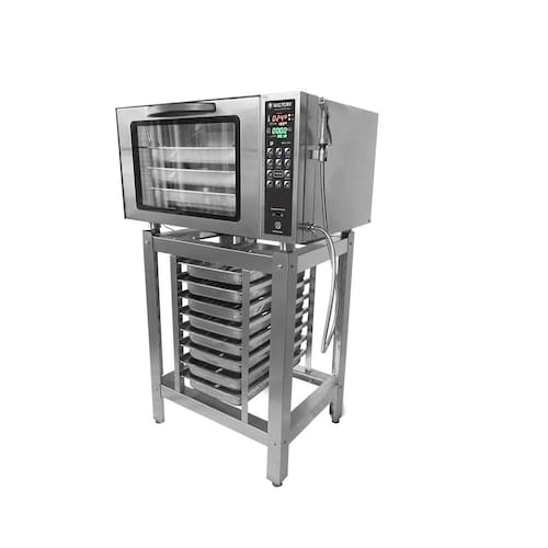 Forno Combinado Com Cavalete Wictory 220V WCAA03G O Forno Combinado Gourmet com 3 esteiras foi pensado tanto para estabelecimentos menores quanto para uso em confeitarias com altas demandas. Possui termopar que proporciona um alto controle de temperatura na câmara de cocção, em conjunto ao calor homogêneo, transforma-se em um otimo equipamento para produtos delicados. Conta com cinco modos de cocção em um único painel de controle: Na Função Vapor temos as seguintes modalidades de cocção: branquear, vaporizar, escalfar, pré-cozer, e entre outras. Na Função Ar Seco, temos as seguintes modalidades de cocção: assar, fritar, gratinar, grelhar, entre outras. Na Função Combinado, é utilizado para cozimento de alimentos em tempos muito curtos sem perder suas características e nutrientes. A Função Regenerar é utilizada para regenerar alimentos resfriados ou congelados, podendo ainda controlar quanto de umidade vai ser necessário para regenerar o alimento. A Função Banho Maria tem opções de trabalhar com baixas temperaturas, muito utilizada em alimentos delicados, ou procedimentos de descongelamento, inclusive em produtos embalados a vácuo. Conta também com funções extras, como a Função Limpeza, que permite realizar a higienização do forno de forma prática e eficiente e Sensor de Núcleo, que é inserido no interior do alimento, notificando em tempo real a temperatura do alimento.