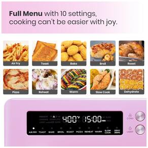 Capacidade Ampla para Família e Festas: Com um espaço 30% a 60% maior do que fornos convencionais, este modelo permite assar um frango de 2,2 a 2,7 kg, tostar até 6 fatias de pão, preparar uma grande porção de batatas fritas, 20 asas de frango ou uma pizza de 30 cm, tornando-o ideal para refeições em família e eventos.