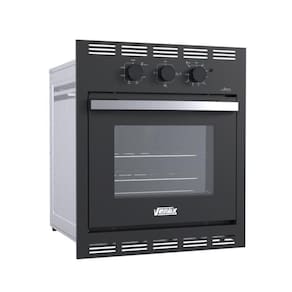 Forno de embutir a gás com capacidade de 50L, acendimento super automático, esmalte Easy Clean, função grill, timer grill, porta removível com vidro duplo, e espeto giratório. Inclui bandeja coletora de resíduos.Timer