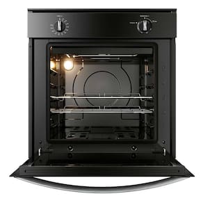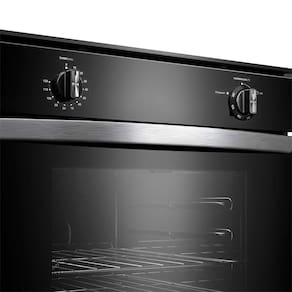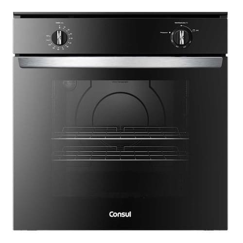 Forno a gás de embutir com capacidade de 78 litros, timer sonoro, grill, design moderno em preto com acabamentos metálicos e revestimento esmaltado para facilitar a limpeza. Possui 2 prateleiras com 5 alturas ajustáveis.Timer