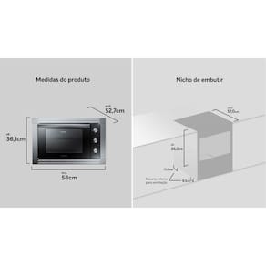 Cor: Espelhado | Largura: 58cm | Altura: 36,1cm | Profundidade: 52,7cm | Dimensões Internas: 39 x 27 x 42 cm | Dimensões do Nicho: 58 x 39 x 57 cm | Garantia: 12 meses | TIpo de Montagem: De Embutir | Capacidade do Forno: 44 litros | Tipos de Forno: Elétrico | Funcionamento: Elétrico | Potência: 1750w | Grill: Sim | Isolamento Térmico: Sim | Acabamento do Forno: Limpa Fácil | Luz no Forno: Sim | Grades do Forno: 1 Grade com 3 níveis de altura | Fabricação: Nacional | Voltagem: 127v