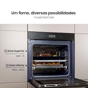 Um forno, diversas possibilidades Função Dual Cook Com dupla convecção, separadas entre as zonas superior e inferior, com temperaturas distintas, você pode cozinhar dois pratos ao mesmo tempo, preservando o sabor de cada receita, ou usar todo o espaço interno do forno para grandes refratários.