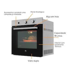 Características Gerais do produto Forno de emetrosbutir a gás cometros grill elétrico. Possui 78 litros de capacidade, controle de temetrosperatura ajustável (160°C a 260°C), timetroser de até 120 metrosinutos cometros aviso sonoro, porta cometros vidro duplo temetrosperado, revestimetrosento interno EasyClean, 3 alturas para grelhas e válvula corta-gás. Design emetros aço inox e vidro preto.