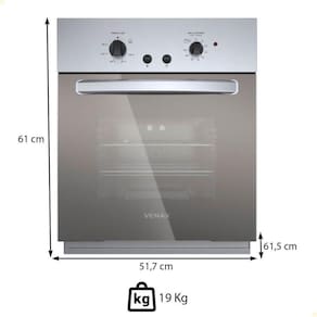 As dimensões externas são 61,5 cm (C) x 51,7 cm (L) x 61 cm (A) e as internas 37,8 cm (L) x 47 cm (P) x 29 cm (A). O forno pesa 19 kg.