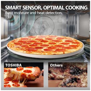 Forno de Micro-ondas Toshiba Air Fryer Combo 4 em 1, 42,5 litros, 1000 watts, acabamento em aço inoxidável, função de fritura saudável com 10 menus automáticos, função de convecção com 4 menus automáticos de assar e 4 de assar, função sensorial com 13 menus automáticos, descongelamento fácil por peso/tempo, cozimento de micro-ondas com 10 níveis de potência, função de manter aquecido, botões de cozimento expresso, função de memória, luz LED, prato giratório de vidro, modo eco, botão de silenciar, relógio e timer de cozinha. Interior em aço inoxidável resistente a arranhões e ferrugem, fácil de limpar. Combo 4 em 1 com funções de micro-ondas, fritadeira a ar, convecção e combinação de cozimento. Prato giratório removível acomoda um frango inteiro ou pizza.Função Grill