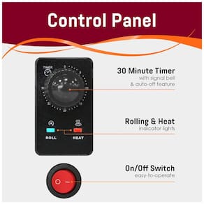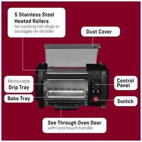 Cinco rolos aquecidos de aço inoxidável ótimos para cozinhar cachorros quentes ou salsichas em todos os lados Temporizador de forno de 30 min A bandeja de retenção de óleo captura os pingos de óleo de cozinhar cachorros quentes Ótimo para aquecer outros pães e lanches também. Possui 210 watts totais de potência, termostato automático, temporizador, bandeja de assar, bandeja de migalhas que remove para facilitar a limpeza, ver através da porta do forno e design compacto