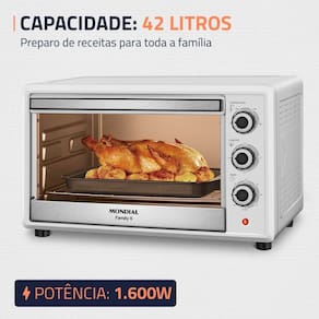 Agora você pode fazer aquela receita tamanho família sem preocupação. O forno elétrico Family II FR-42 da Mondial possui capacidade para 42 litros e é perfeito para aquecer, cozinhar, tostar, assar, gratinar e grelhar de maneira eficiente. Possui controle de temperatura, grelha com regulagem de altura, timer de 90 minutos com desligamento automático e alta potência de 1600W. Saiba mais sobre o FR-42 da Mondial: CAPACIDADE DE 42 LITROS Alto desempenho e ótimo espaço! Ideal para o preparo de receitas para toda a família. MULTIFUNÇÕES Ideal para aquecer, cozinhar, tostar, assar, gratinar e grelhar de maneira rápida e eficiente. POTÊNCIA DE 1600W Alta potência que assegura mais agilidade e eficiência no preparo de receitas variadas. SELETOR DE RESISTÊNCIA São 3 opções de aquecimento interno para distribuir melhor o calor. TIMER DE 90 MINUTOS Mais liberdade e segurança para você fazer outras tarefas enquanto o forno trabalha. Com aviso sonoro, o aparelho desliga automaticamente ao término do preparo. MAIS PRATICIDADE A regulagem de altura da grelha oferece versatilidade para um cozimento ideal. CONTROLE DE TEMPERATURA De 100°C até 250°C: Ajuste a intensidade da temperatura de acordo com a receita que vai preparar. PUXADOR E BOTÕES EM AÇO INOX Design moderno, com mais durabilidade e resistência. A Mondial é a escolha de milhões de consumidores. Mondial, a escolha inteligente!