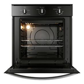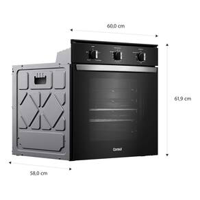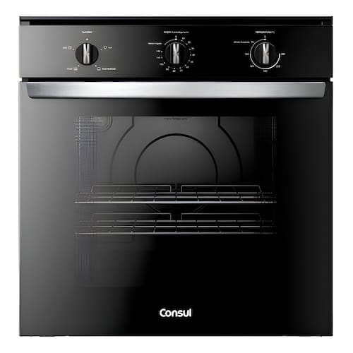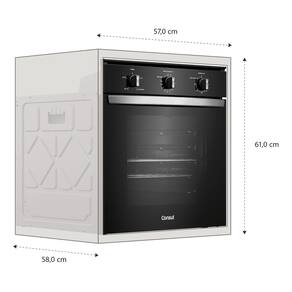 Forno elétrico de embutir com design moderno em preto, acabamentos metálicos e revestimento esmaltado que facilita a limpeza. Possui alta capacidade de 84 litros, 2 prateleiras com 5 níveis de altura ajustáveis, timer com desligamento automático e grill elétrico.Timer